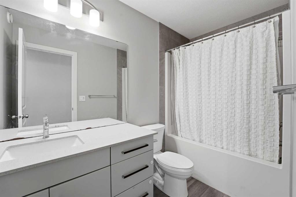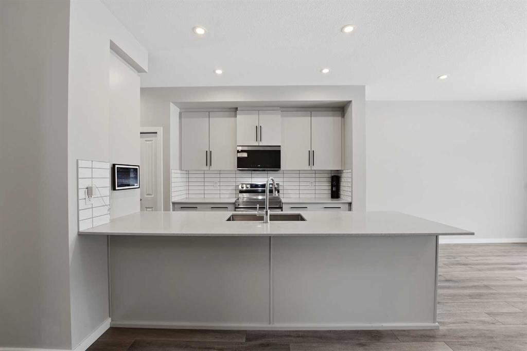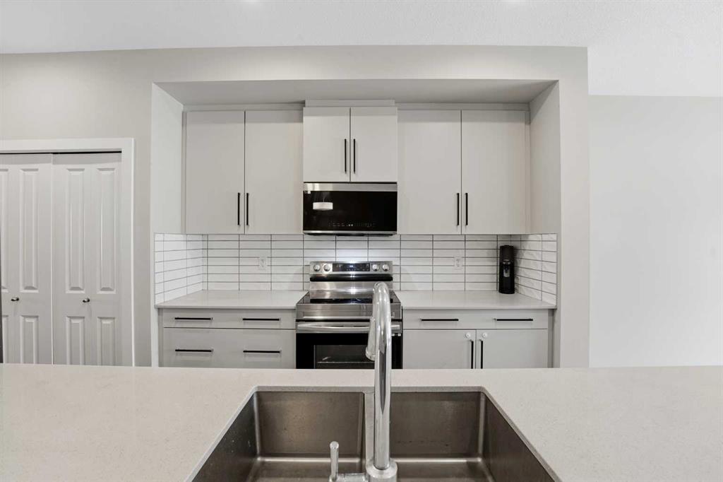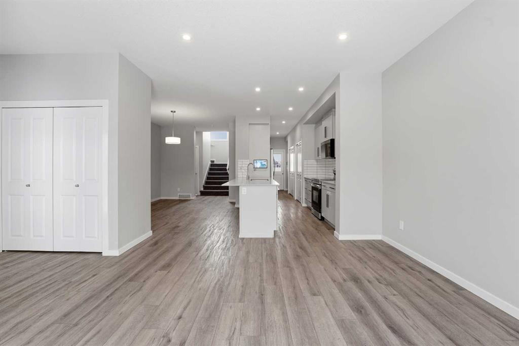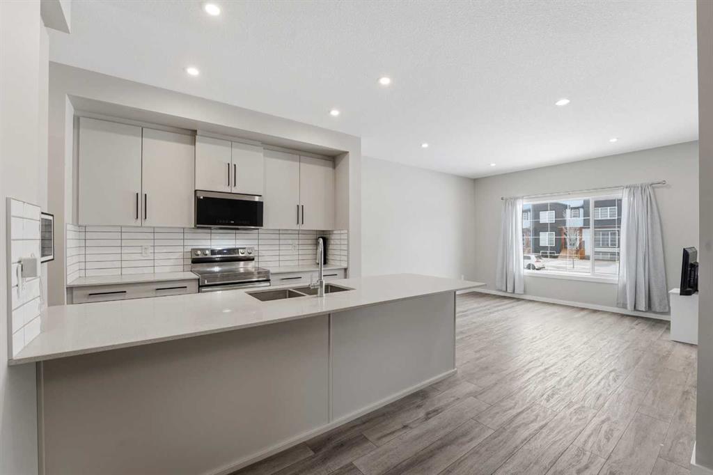 A two storey house with 3 bedrooms and 3 bathrooms. The front entryway greets you to the open style floor plan with laminate flooring that runs through the main floor. The living room is flooded with natural light through the large front window. Ceiling height kitchen cabinets are accented by quartz countertops, a new microwave hoodfan, stainless steel appliances, full tile backsplash, a large eating bar island with a sink, pot/pan drawers and a pantry for your convenience. There is a nice sized eating area...