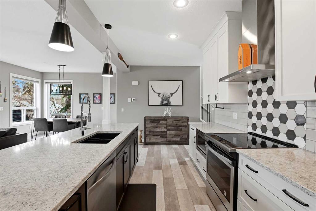 A former showhome that still shows like one—this fully finished home offers a bright, functional layout with high-end finishes and thoughtful upgrades throughout. The main floor welcomes you with an open concept design filled with natural light, creating an inviting space for both everyday living and entertaining. The kitchen is a true standout, featuring quartz countertops, stainless steel appliances, a black granite composite sink, and full-height cabinetry accented by a stylish backsplash and feature hoo...